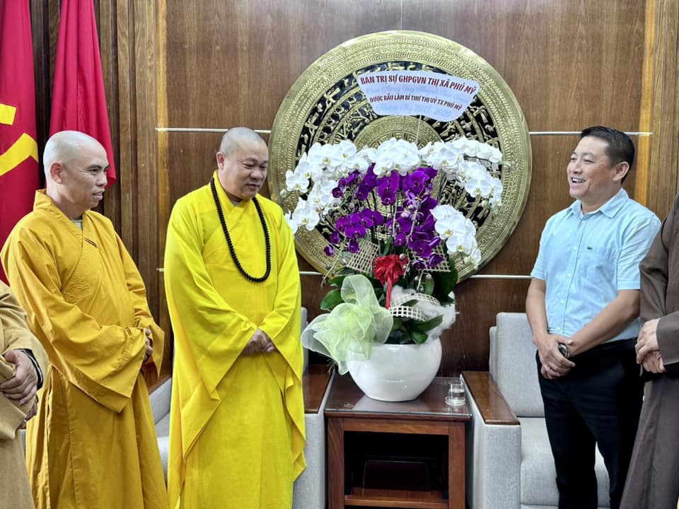Tiếp đoàn, ông Huỳnh Sơn Tuấn bày tỏ sự cảm ơn sâu sắc tới Hòa thượng Thích Quảng Hiển và Thường trực Ban Trị sự Phật giáo thị xã Phú Mỹ đã quan tâm, thăm hỏi; đồng thời mong muốn GHPGVN tỉnh và GHPGVN thị xã Phú Mỹ tiếp tục tuyên truyền, vận đồng Tăng, Ni, Phật tử trên địa bàn thị xã chấp hành tốt chủ trương, đường lối của Đảng, chính sách, pháp luật của Nhà nước; sống “tốt đời, đẹp đạo”; thực hiện các hoạt động Phật sự theo đúng pháp luật và Hiến chương Giáo hội Phật giáo Việt Nam, góp phần vào việc giữ gìn an ninh trật tự; củng cố, xây dựng khối đại đoàn kết toàn dân tộc; phát triển Thành phố Phú Mỹ ngày càng văn minh, hiện đại