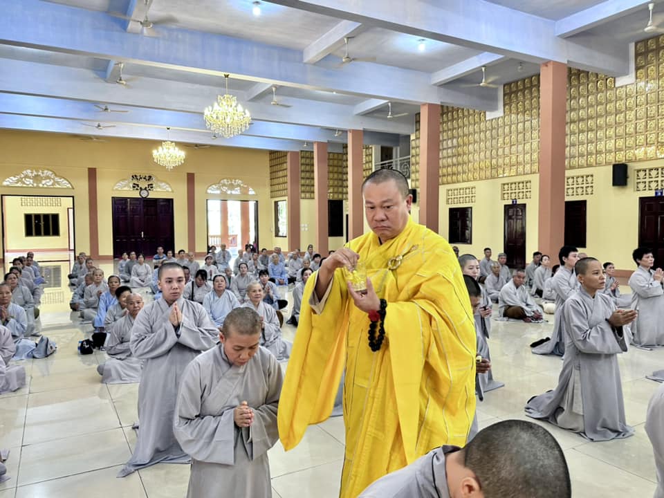 Tại nơi Đại hùng Bảo điện, Đức Trưởng lão Hòa thượng viện chủ đã trang nghiêm niêm hương bạch Phật và khai thị cho các thiện nam tín nữ trước khi thế phát. Theo đó, Hòa thượng sách tấn các vị hảo tâm xuất gia là những người có căn lành, phước đức và nhân duyên rất lớn, hiểu được thế gian vô thường, ta bà nhiều khổ đau mà cần cầu giải thoát. Người phát tâm xuất gia phải có ý chí quyết tâm ra khỏi nhà thế tục, nhà phiền não và nhà Tam giới. Ra khỏi nhà thế tục là cắt đứt sợi dây tình cảm luyến ái của gia đình, bà con, họ hàng để dễ dàng thực hiện lý tưởng của người xuất gia. Ra khỏi nhà phiền não là tập đoạn trừ những phiền não buồn, thương, giận hờn, yêu, ghét… Ra khỏi nhà Tam giớ là ra khỏi nhà Dục giới, Sắc giới và Vô Sắc giới. Để đạt được lý tưởng cao đẹp đó, người xuất gia phải siêng tinh tấn tham gia tu tập tụng kinh, niệm Phật, kinh hành… ngoài ra còn phải học thuộc các giới luật Trường hàng và thực hành các oai nghi đi, đứng, nằm, ngồi…