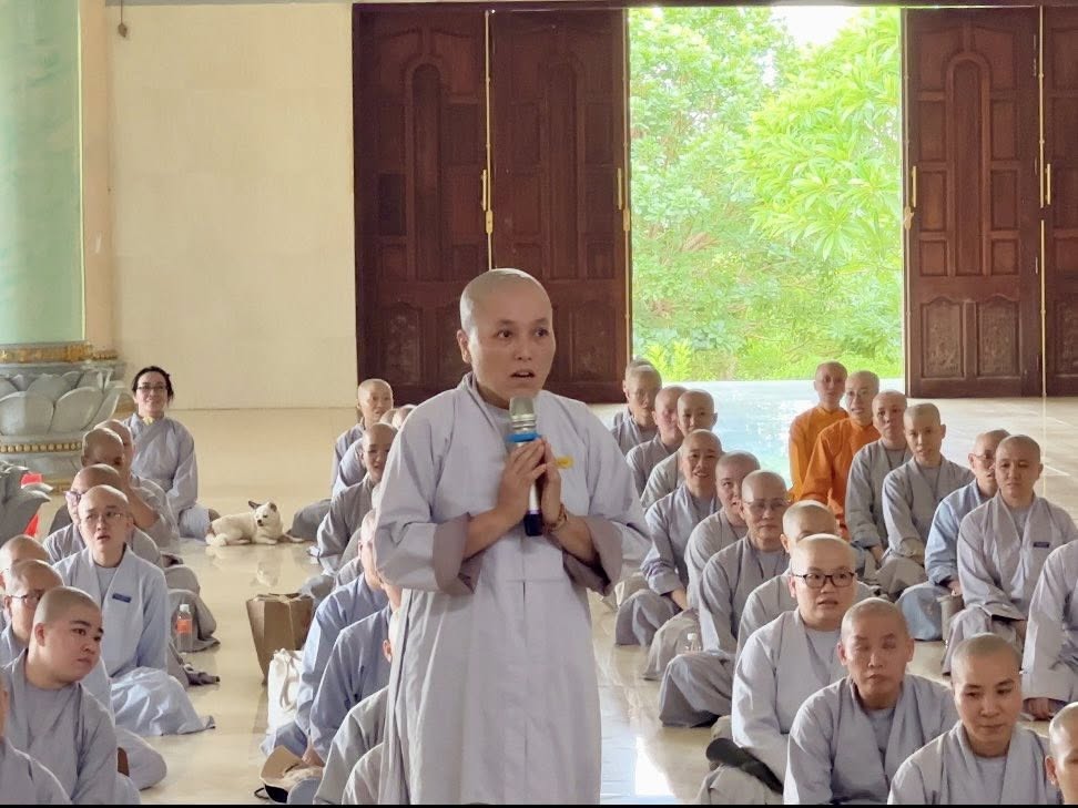 Rời khu ngôi Bảo tháp cổ kính trong sự hoài niệm ân đức Tổ sư, Đoàn đến tham quan tịnh xá Linh Quang (Hòn Một) phía dưới chân núi Minh Đạm. Tại đây, các Tăng Ni 2 lớp Cao đẳng và lớp Trung cấp lắng nghe lời chia sẻ, sách tấn của Hòa thượng Thích Thông Luận, trụ trì thiền viện Chân Nguyên, Thượng tọa Thích Minh Luận trụ trì tịnh xá Linh Quang cũng như chư tôn đức Ban Giám hiệu. Đồng thời Tăng Ni sinh 2 lớp Cao đẳng và Trung cấp có dịp giao lưu, ôn lại kiến thức gặt hái được tại trong suốt chuyến đi và phát biểu cảm tưởng sau chuyến đi.