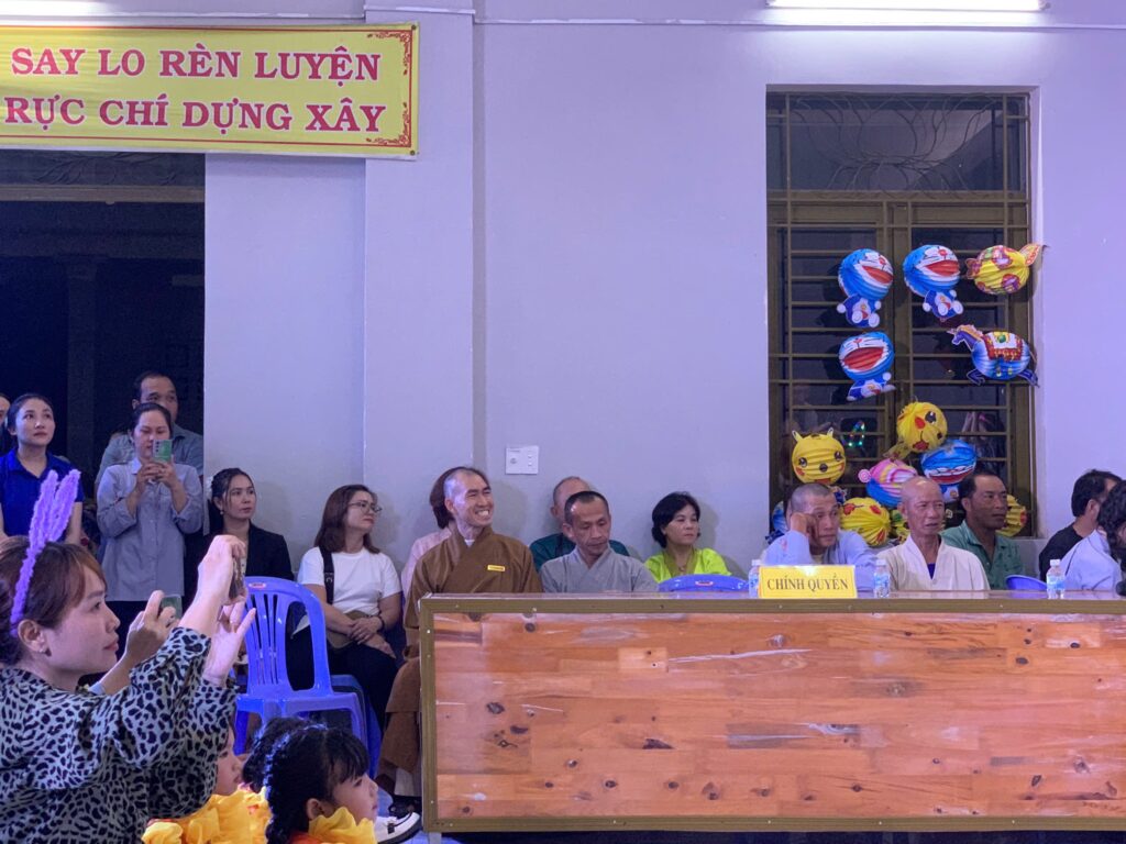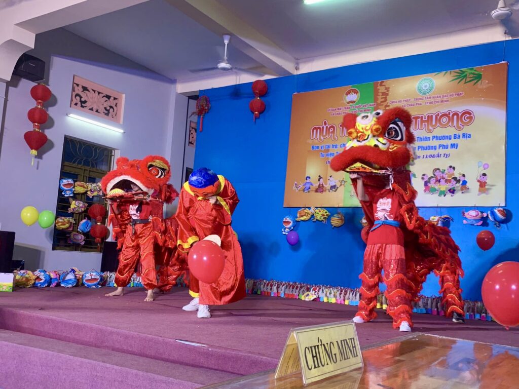 Tai buổi tặng quà, các chú tiểu thuộc Trung tâm Nhân đạo Hộ Pháp, và các em học sinh đã lắng nghe lời phát biểu khai mạc của Thượng toạ Thích Nhuận Nghĩa, Uỷ viên HĐTS, Phó Trưởng Ban Trị sự Phật giáo TPHCM, Trưởng Ban Tổ chức và lời chúc mừng Tết Trung thu của đại diện lãnh đạo chính quyền địa phương. Tiếp đó, các em nhỏ được thưởng thức chương trình văn nghệ, chương trình múa lân đặc sắc do các chú tiểu và các em gia đình Phật tử Hộ Pháp, gia đình Phật tử Hồng Quang, các em học sinh trường tiểu học Tóc tiên biễu diễn.