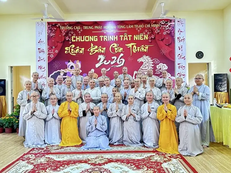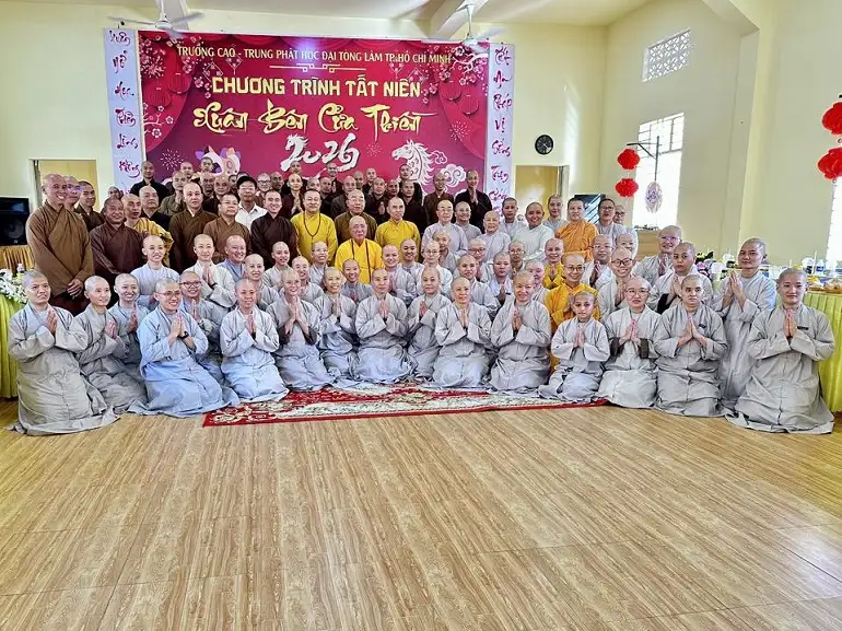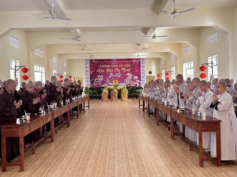 Trong không khí hân hoan đón chào mùa xuân Di lặc và chuẩn bị khép lại 3 năm tu học viên mãn, chiều nay, ngày 9/2/2026 (nhằm ngày 22 tháng Chạp năm Ất Tỵ) tại Trường Cao – Trung cấp Phật học Đại Tòng Lâm, chương trình Lễ Tất niên với chủ đề “Xuân bên cửa thiền” đã được tổ chức trang nghiêm và thắm tình đạo vị.