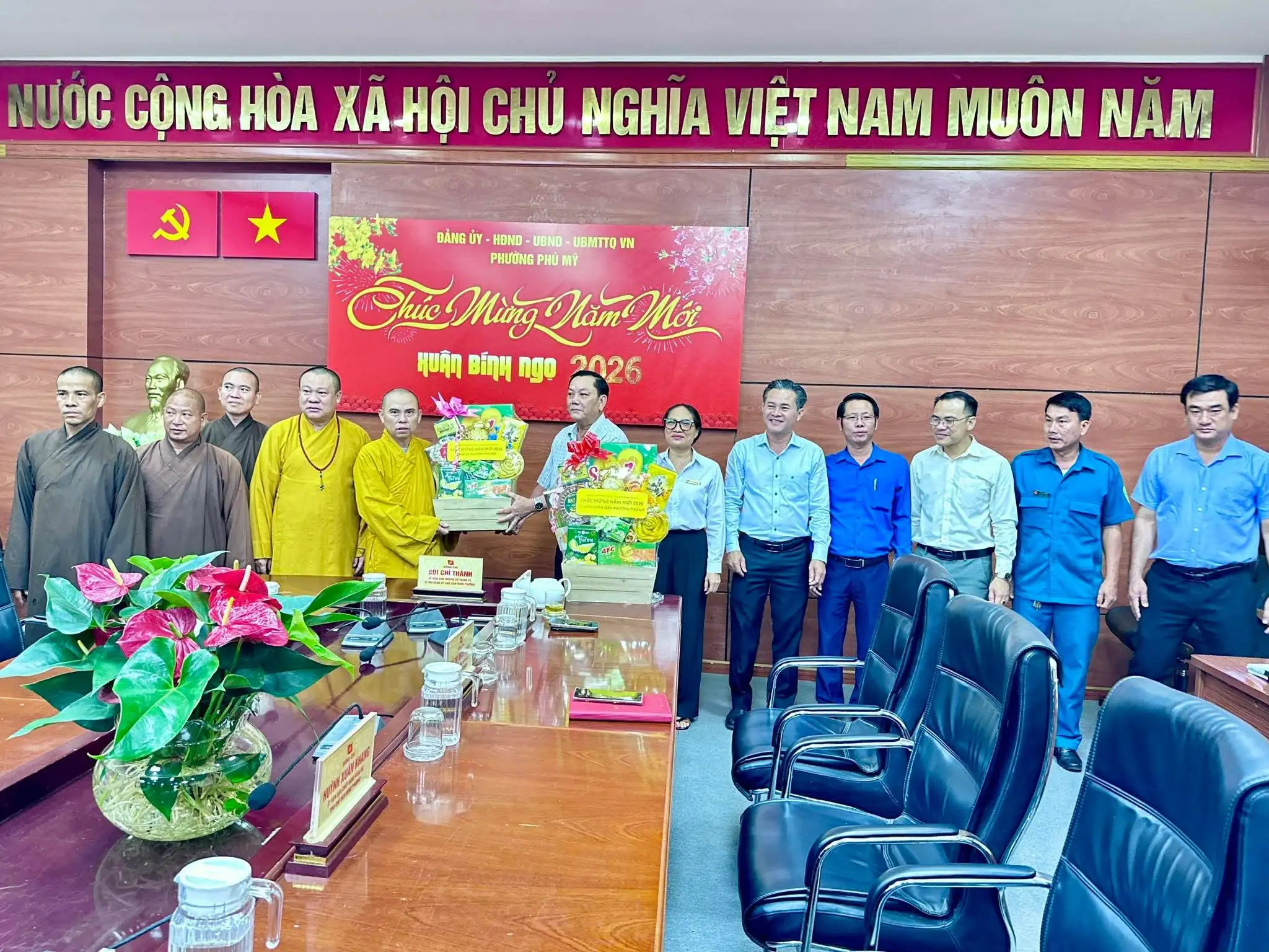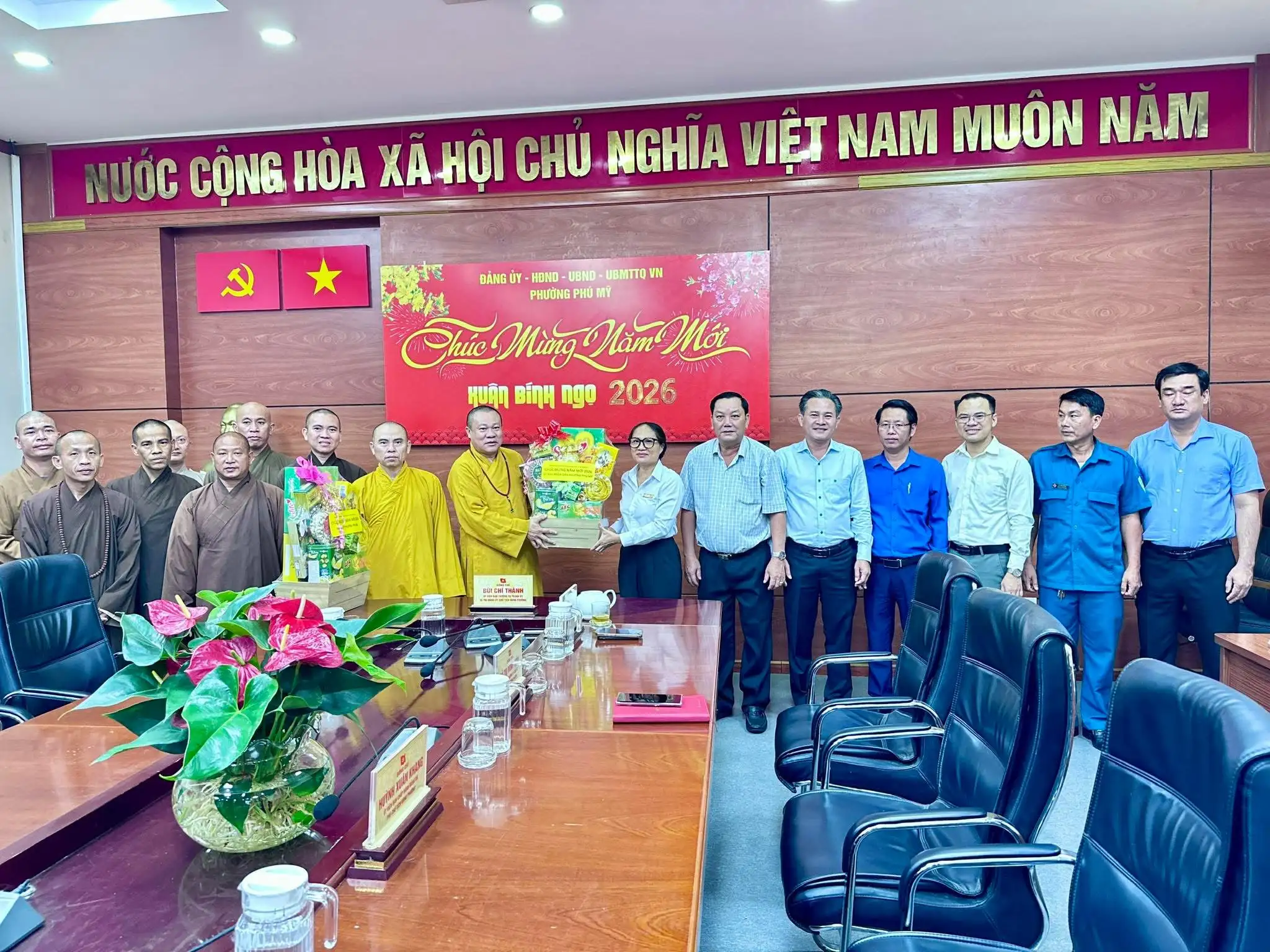 Sáng ngày 10/2/2026 (nhằm ngày 23 tháng Chạp năm Ất Tỵ), trong không khí hoan hỷ của những ngày đầu xuân, phái đoàn đại diện Ban Giám hiệu Trường Cao – Trung cấp Phật học Đại Tòng Lâm, Ban Quản trị Tổ đình Đại Tòng Lâm và Ban Quản trị Tổ đình Hộ Pháp đã đến thăm và chúc Tết lãnh đạo Đảng ủy, HĐND, UBND, UBMTTQVN cùng các cơ quan ban ngành phường Phú Mỹ.