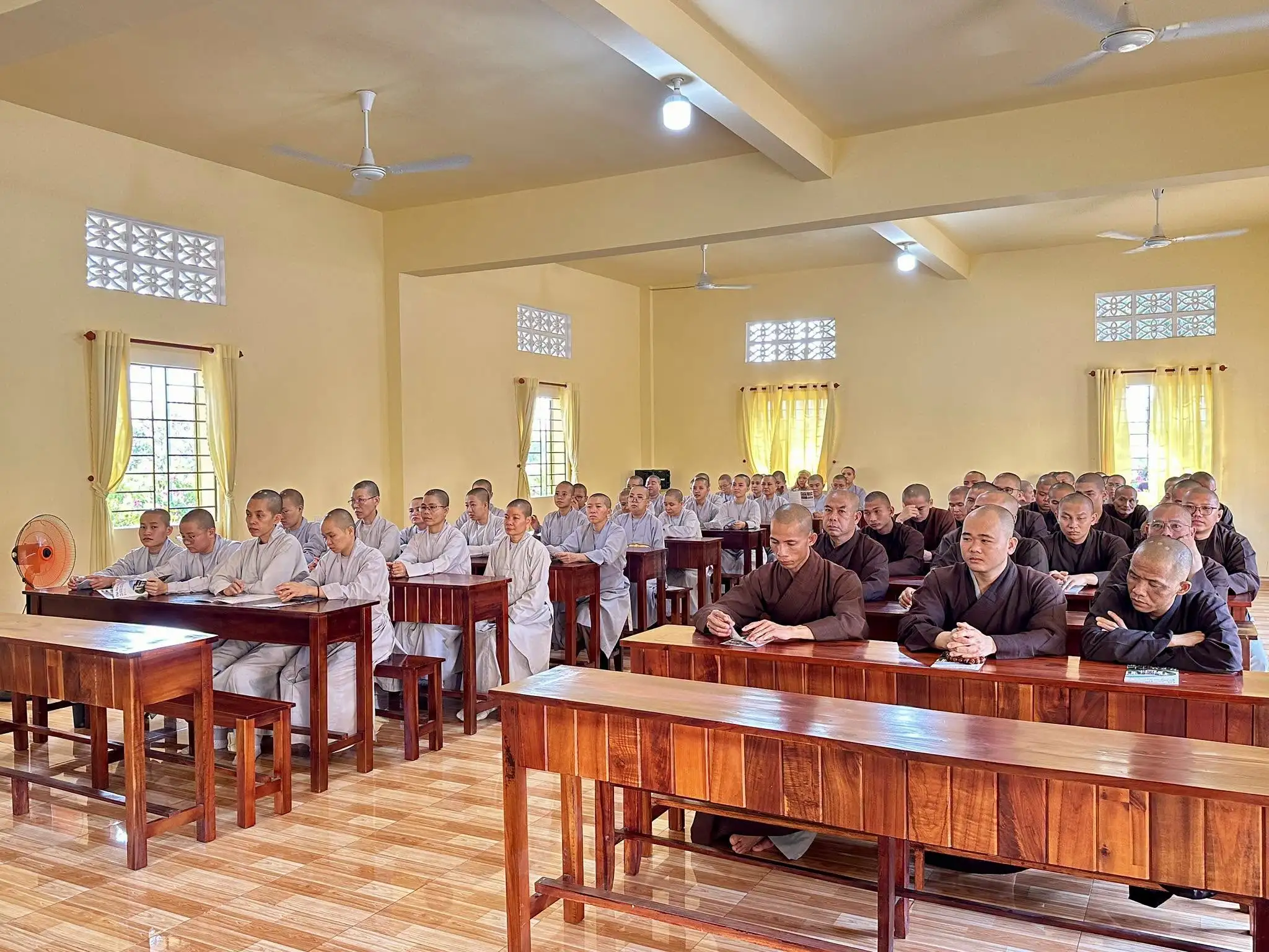 Tại giảng đường lớp Cao đẳng Phật học, thay mặt Ban Giám hiệu, Thượng tọa Thích Nhuận Nghĩa đã có lời phát biểu hoan hỷ chào mừng phái đoàn. Thượng tọa bày tỏ niềm vinh hạnh khi được đón tiếp những bậc học giả, chư Tôn đức đến từ Đại học Hoa Phạm và Liên Hoa Phật học viện. Nhân dịp này, Thượng tọa cũng thông tin sơ bộ đến phái đoàn về công tác đào tạo của Trường Trung cấp Phật học Đại Tòng Lâm. Kể từ ngày thành lập đến nay, nhà trường đã đào tạo hơn 2.500 Tăng Ni sinh tốt nghiệp. Vừa qua, trường cũng đã long trọng tổ chức lễ khai giảng cho lớp Trung cấp Phật học khóa 12 và lớp Cao đẳng Phật học khóa 10. Hiện tại, trường đang áp dụng chương trình giáo dục chuẩn do Ban Giáo dục Phật giáo Trung ương đề ra. Đặc biệt, Tăng Ni sinh theo học tại đây được nhà trường đài thọ nội trú và hoàn toàn miễn phí 100% học phí cũng như sinh hoạt phí, nhằm tạo điều kiện tốt nhất cho việc chuyên tâm tu học.